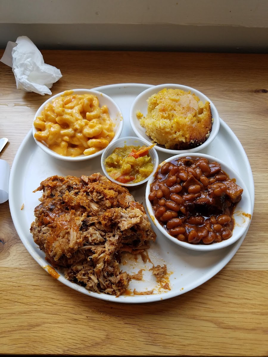Whole Hawg w Beans Macaroni and Cheese and Corn Pudding